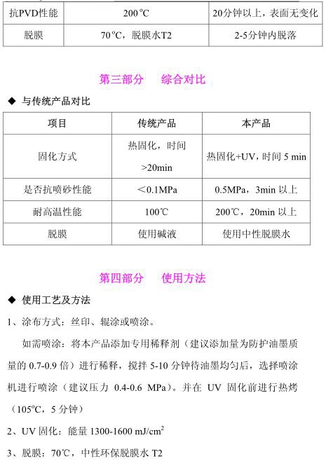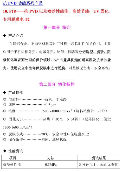 F18——抗PVD以及噴砂性能佳,高效節(jié)能;UV固化、專用脫膜水固化、專用脫膜水 T2