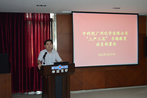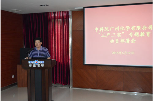 6月19日,中科院廣州化學有限公司(廣州化學)召開“三嚴三實”專題教育動員部署會議。廣州化學中層及以上領導干部、全資及控股公司高管人員、在職及離退休黨支部書記參加會議,會議由廣州化學黨委副書記劉偉區主持。