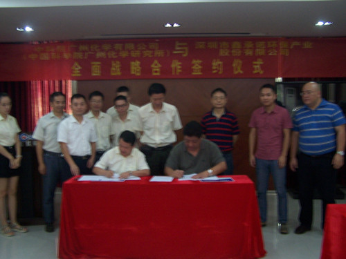 2015年9月25日,中科院廣州化學有限公司董事長胡美龍與深圳市鑫承諾環(huán)保產(chǎn)業(yè)股份有限公司董事長丁玉清分別代表雙方簽署了“新型特種精細化學品”戰(zhàn)略合作協(xié)議。