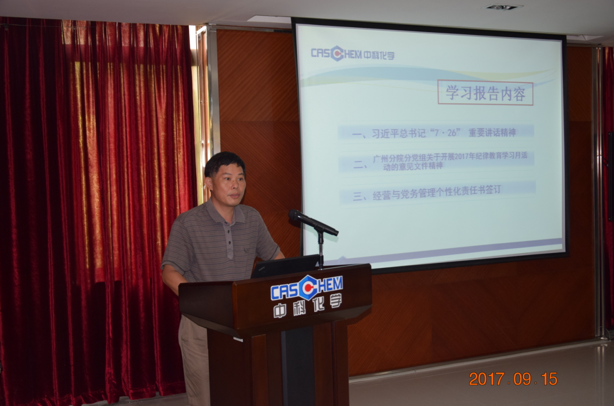 9月15日,中科院廣州化學有限公司(廣州化學)召開中心組會議,進行以“講政治、強黨性、嚴紀律、守規(guī)矩”為主題的紀律教育月學習活動。廣州化學中層及以上領導干部、黨委委員、紀委委員、全資及控股公司領導班子成員、在職黨支部書記、團委書記參加會議。