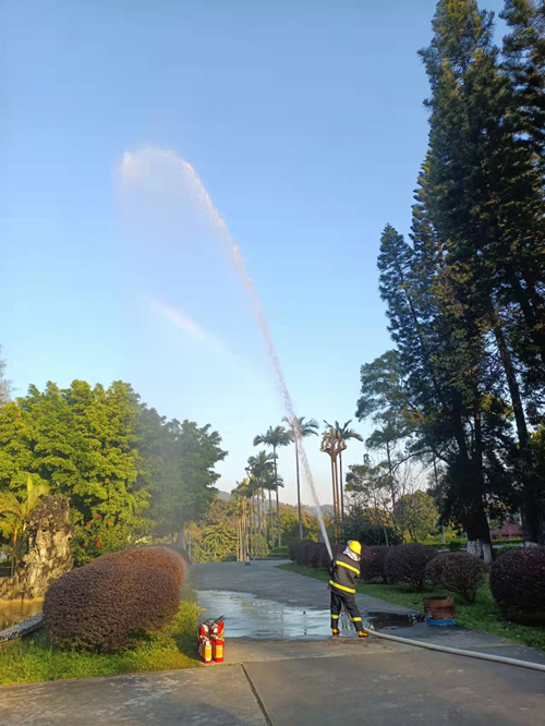 隨后全體參會人員移步實驗樓廣場,保利物業現場演示了實驗樓消防系統滅火,教官對現場展示的防火面罩、滅火器、消防剪、消防帶等器材進行操作說明。