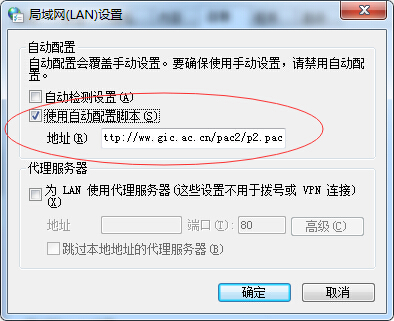 (2) 在彈出的窗口中選擇“使用自動配置腳本(S)”,在“地址(R)”中輸入: