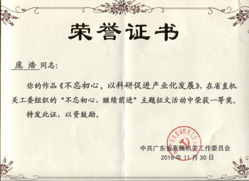 根據廣東省直機關工委“不忘初心、繼續前進”專題征文活動(征文活動)的評審結果,中科院廣州化學有限公司(廣州化學)龐浩撰寫的《不忘初心,以科研促進產業化發展》一文獲得該征文活動一等獎。