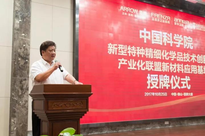 10月25日,在樂華集團箭牌總部大廈,舉辦了“中國科學院新型特種精細化學品技術創新與產業化聯盟(精細化學品聯盟)新材料應用基地”授牌儀式。國科控股董事、總經理索繼栓,中科院廣州化學有限公司(廣州化學)黨委書記、董事長胡美龍,廣東省建材協會會長吳一岳,樂華家居集團董事總經理謝岳榮等領導和嘉賓出席了授牌儀式。