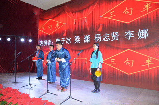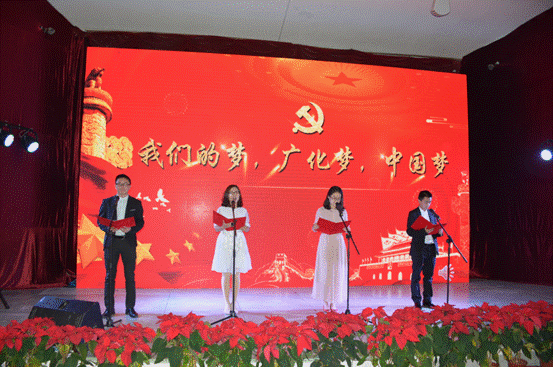 文藝匯演開始前,廣州化學全體領導班子成員走上舞臺向全體員工獻上了新春的祝福。文藝匯演在嘹亮的《 歌唱祖國 》中拉開了序幕,詩朗誦《我們的夢、廣化夢、中國夢》展現了廣化人頑強拼搏,為夢想不斷努力奮斗的精神;手語舞蹈《愛》勾起了大家滿滿的回憶;語言節目《三句半》引起了滿堂的歡聲笑語;獨舞《羞答答的玫瑰靜悄悄的開》,以優雅的舞姿為文藝匯演注入一股清新的暖流;吉他彈唱《成都》+《夜空中最亮的星》歌曲或深情款款、或歡快明朗,帶動了匯演的氣氛;《三人小人舞》不時地引得現場觀眾爆發出陣陣的笑聲和掌聲。節目過程中還穿插了抽獎環節與臺下觀眾進行了互動。