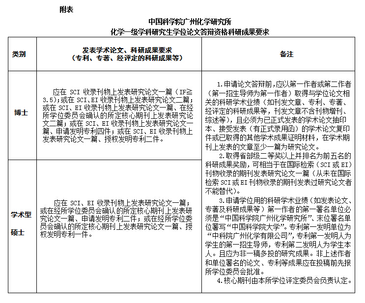 學位申請人提出學位論文答辯,科研學術成果須滿足附表《中國科學院廣州化學研究所化學一級學科研究生學位論文答辯資格科研成果要求》。